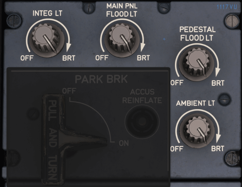 This knob controls the floodlighting over the pedestal area, where the throttle and other control systems like the radio and flight management systems are located. This light allows for better visibility of the pedestal controls, especially important during critical flight operations.